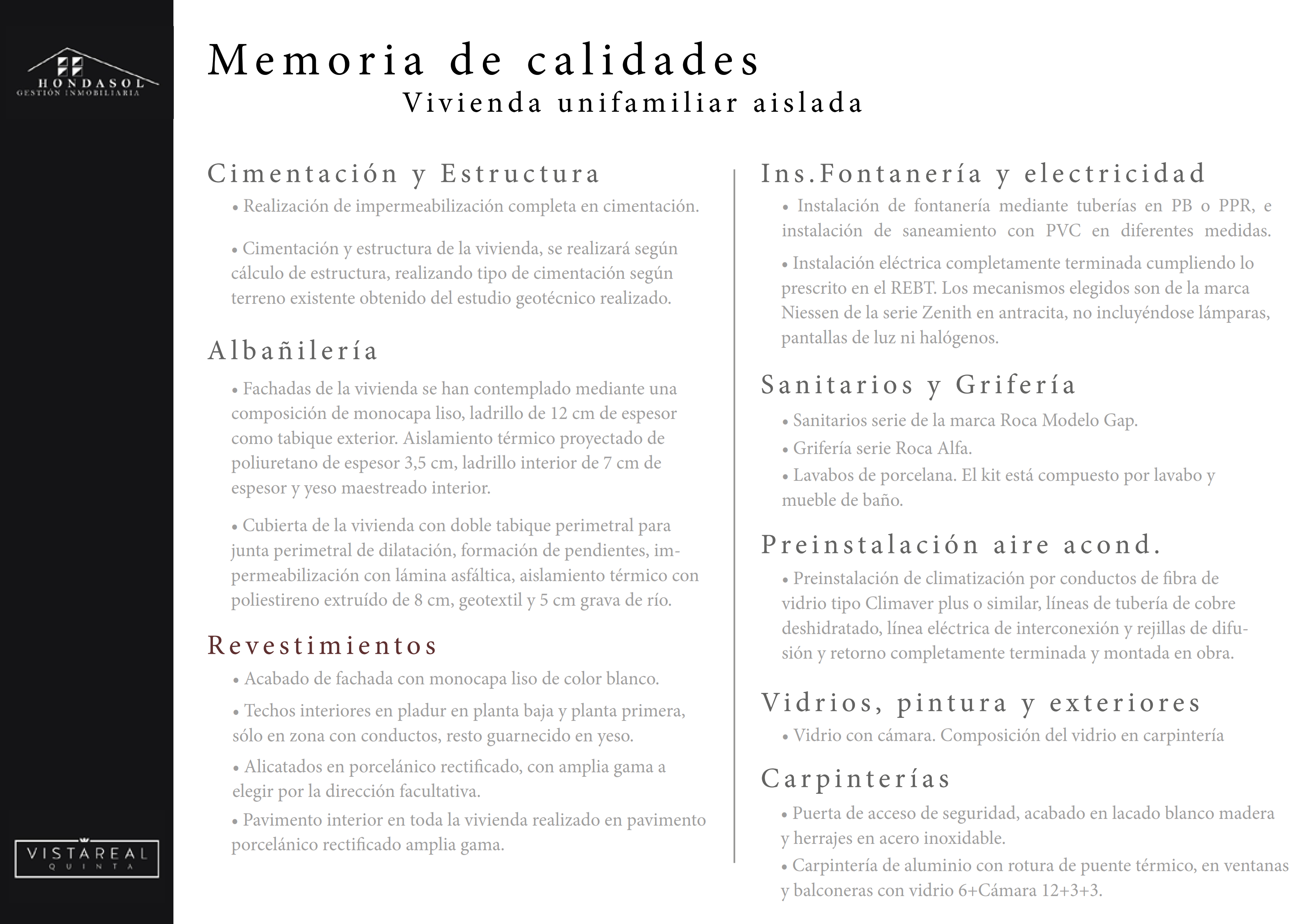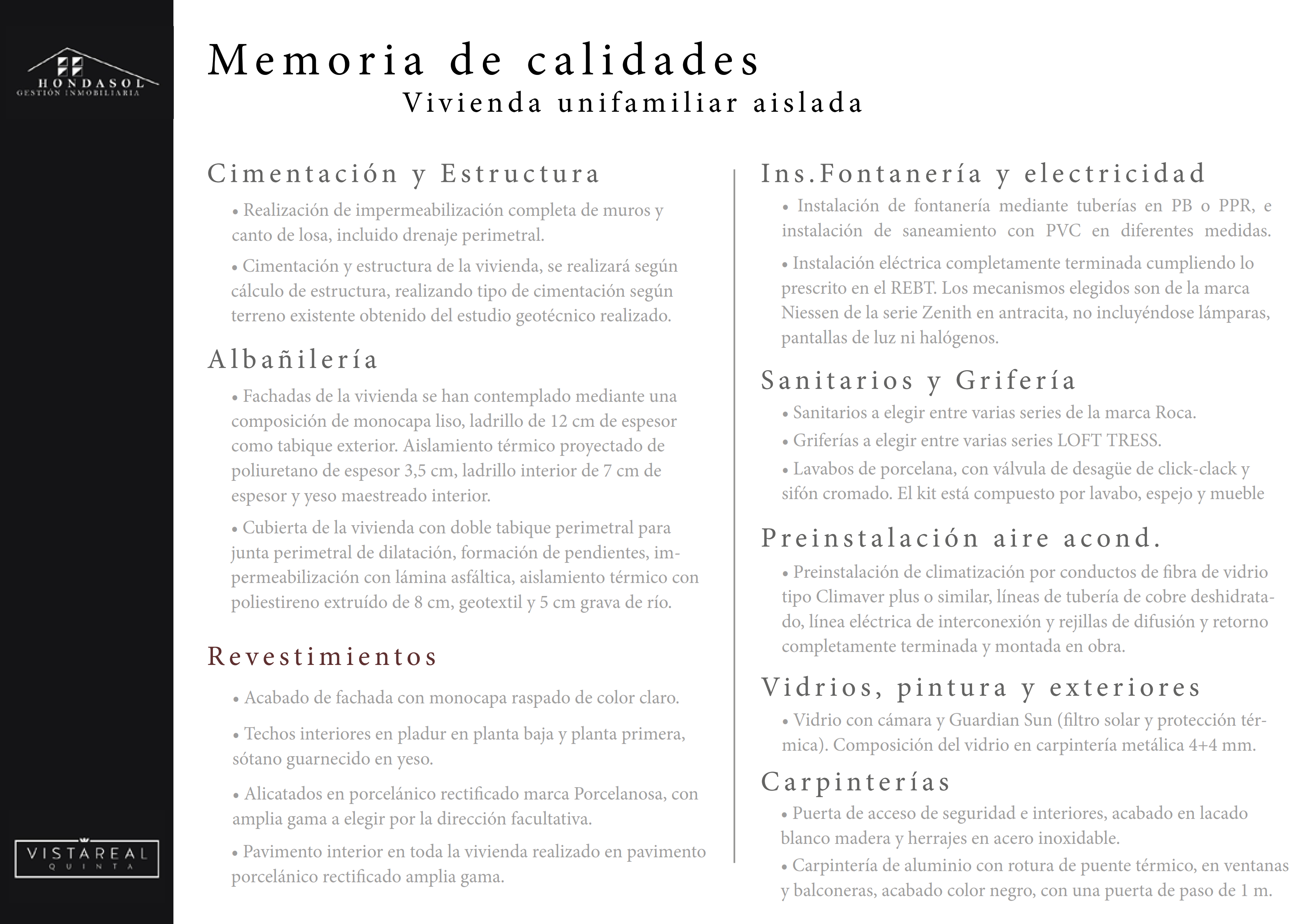 Un valor añadido y pilar fundamental de nuestra empresa es la calidad de nuestra memoria de calidades. Trabajamos con los mejores materiales del sector de la construcción así también como con las mejores empresas a nivel nacional para ofrecer unas calidades superiores en todos nuestros proyectos.